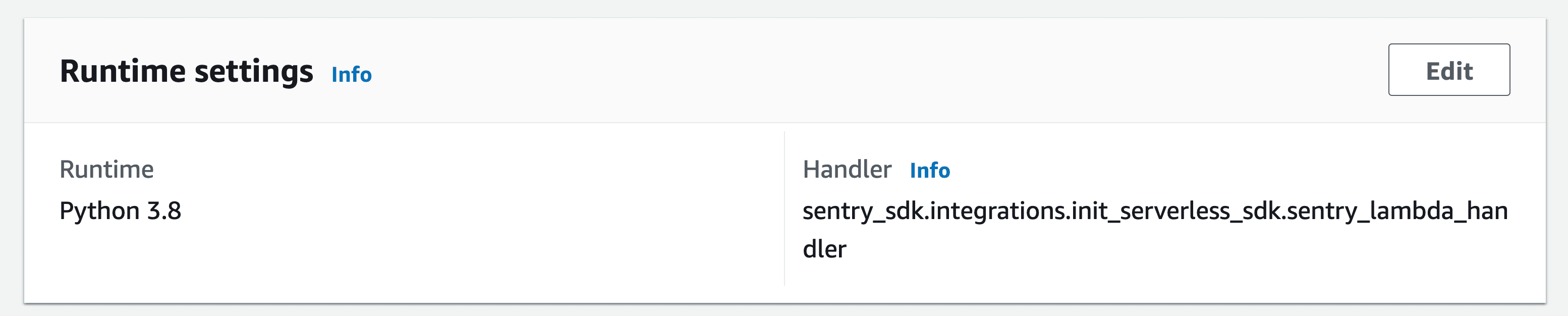 • SENTRY_INITIAL_HANDLER: This stores the value of your Runtime handler. If you choose to disable the Sentry layer, this value will be used to set the Runtime handler.
